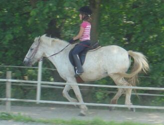 Das Jahr 2005 war ein tolles Jahr für Mandoline und mich. Meine Tochter Julia war schon seit längerem mit dem Pferdevirus infiziert. Julia hatte seit ihrem 5. Lebensjahr voltigiert und begann in diesem Jahr mit den ersten Reitversuchen. Julia macht rasch Fortschritte, am meisten beeindruckte ihre Unerschütterlichkeit. Auch wenn sie mal vom Pferd fiel, vergoß sie keine Träne sondern war flugs wieder auf dem Pferd. Je sattelfester Julia wurde desto mehr entstand bei mir die Vision von gemeinsamen Ausritten. Ich begann Julia zu allen möglichen Events rund ums Pferd mitzunehmen. Manches muß für eine siebenjährige extrem langweilig gewesen sein. Trotzdem verflog Julias Interesse nicht. In den Osterferien fuhr Julia zum ersten Mal alleine in Reiterferien. Es ging auf einen Isihof im Bergischen Land. Zum Abschluß konnten die Kinder auf dem Hof ihren Eltern in einem kleinen Schauprogramm zeigen was sie gelernt hatten. Julia war sichtlich stolz und glücklich mit "ihrem" Pony.