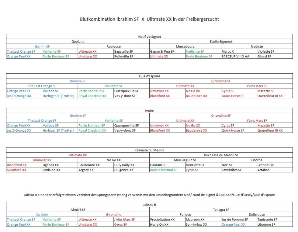 Im internationalen Sport sowie in der Sportpferdezucht hat die Kombination von Ultimate XX mit Ibrahim SF einen imposanten Einfluss. Kombinationen der Linienführung über den Selle francais Hengst Ibrahim SF mit dem Vollblüter Ultimate XX sind immer wieder erfolgreich, auch in die Freibergerzucht, eingekreuzt worden. Von den drei Vollbrüdern dieser Blutkombination: Que d'Espoire, Ivoire und Almé Z, ist Almé Z der erfolgreichste, er hat die europäische Springpferdezucht entscheidend mitgeprägt. Im Gegensatz zu den anderen beiden, ist Almé jedoch nicht in der Freibergerzucht eingesetzt worden. Almé Z ist mit Nachkommen wie Jalisko B, Quidam de Revel oder Baloubet de Rouet unsterblich geworden.