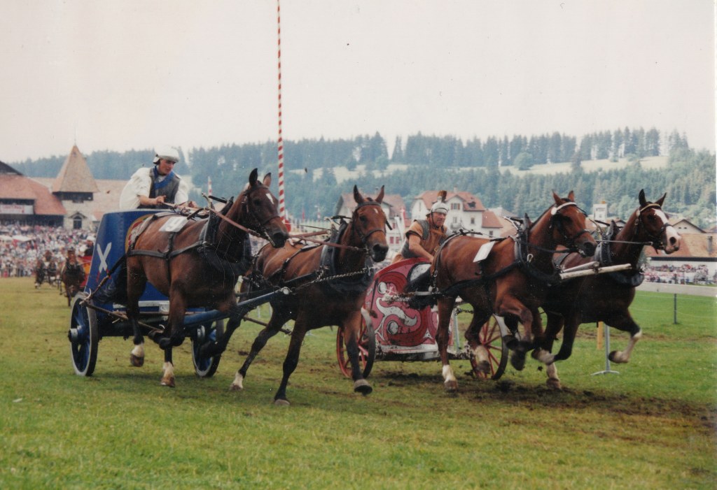 Frossard jnr.: Wir haben beides gehabt. Die Noé-Stuten waren auch ganz gut, aber nicht so schnell. Sie waren vielleicht etwas ruhiger, aber sie haben einfach nicht diese Gänge gehabt. Qui-Sait hatte unglaubliche Gänge, er ist geflogen. Vielleicht waren die Qui-Sait im Kopf etwas schwieriger, einfach keine Pferde für Jedermann. Wenn man die Qui-Saits gut gezüchtet hat und sie gut eingefahren hat waren die Qs super, super super Pferde. Bei den ersten Einkreuzungen mit Alsacien, bekam man tolle Pferde, die waren im Kopf sehr gut. Bei den nächsten Kreuzungen mit Noé und Qui-Sait hat man gedacht, daß es genauso wird. Man glaubte, man könnte gute Gänge bekommen und alles andere an den Pferden bleibt so wie es ist, dass sie stehen bleiben und solche Dinge. Und so war es dann doch nicht. Für meinen Vater und viele andere Züchter war das kein Problem. Sie wussten wie man mit einem solchen Pferd umgeht, das mehr Blut hat. Für andere Züchter, die immer sehr ruhige Freiberger hatten, Pferde, die nie einen Schritt rückwärts gehen oder mal einen Schritt nach vorne machen, war es schwierig. Diese Leute hatten keine Erfahrung mit Pferden, die etwas nervöser waren. So bekamen die Q’s ihren schlechten Ruf. Dann hieß es plötzlich, mit denen kann man ja nichts machen. Wir hatten 5 Qui-Saits, die 4 Stuten und auch noch einen Wallach. Wir haben alles mit diesen Pferden gemacht, wir sind sie am Römerwagen gefahren, Malaisie konntest du einem 5-jährigen Kind geben, um sie auf die Weide zu führen, Quinquina auch. LC haben wir jetzt verkauft, die fährt noch Rennen. Prunelle hatte Pech, sie ist an einer Kolik gestorben.