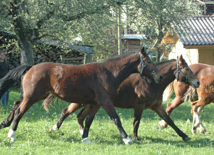 Der Herbst kam und damit einher auch die Fohlenschauen in der Schweiz. Auf der Fohlenschau in Thun begegnete ich Lunas jüngster Schwester Miss, die noch keinen Käufer hatte. Ich kaufte sie mit der Überzeugung, dass ich einen guten Platz in Deutschland für sie finden würde. Das war dann ja auch so. Mein Mann wollte auf keinen Fall noch ein Pferd mehr. Von Queshya konnte ich mich nicht trennen. Miss ging in den Besitz von meiner Freundin Renate über, die beiden hatten sich gesucht und gefunden. Luna war sehr sehr weit weg, trotzdem konnte ich die Hoffnung nicht so recht aufgeben. Luna selbst bestärkte mich darin, denn jedes Mal wenn ich sie besuchte, sei es bei Klaus, auf einer Fohlenweide im Berner Oberland oder gar im Jura ich rief sie und sofort kam sie zielstrebig zu mir, ha und nicht zu Tanja, Klaus oder anderen. Zunächst dachten wir noch es sei Zufall, aber mit der Zeit wurde klar, dass es keiner war.