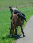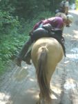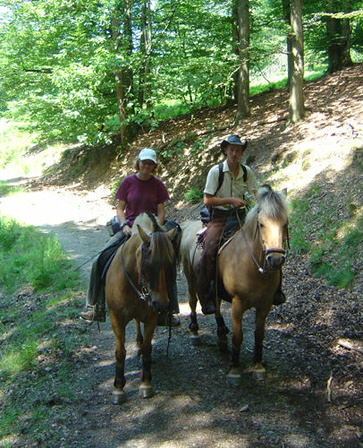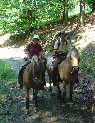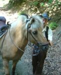 Ich bin so zufrieden mit Mandoline, daß ich sagen kann: Wir haben zwar nicht unser Traumpferd gekauft aber dann doch unser Traumpferd bekommen! Im Mai konnte ich Mandoline nach positiver Trächtigkeitsuntersuchung nach Hause holen. Endlich! Danach arbeiteten wir an der Kondition. Inzwischen war meine Tochter Julia auch dem Pferdevirus erlegen. Mandoline war so weit, daß sie Julias Pferd für Longestunden wurde. Das klappte prima auch wenn Mandoline deutlich lieber ins Gelände ging. Im Juli brachen Klaus, Renate und ich zu einem kleinen Wanderritt auf. Es war wunderschön und wir machten einige interessante Bekanntschaften. Am letzten Tag des Wanderritts scheuerte sich Mandoline leider den Ballen am Hufschuh auf. Am nächsten Tag war das Bein dick. Der Tierarzt diagnostizierte einen banalen Schaden an der tiefen Beugesehne - Sch.... Durch die feuchten Wickel und den aufgescheuerten Ballen bekam Line auch noch eine dicke Mauke. Mandoline musste einige Wochen stehen und konnte erst im August wieder zu der Herde auf die Weide.