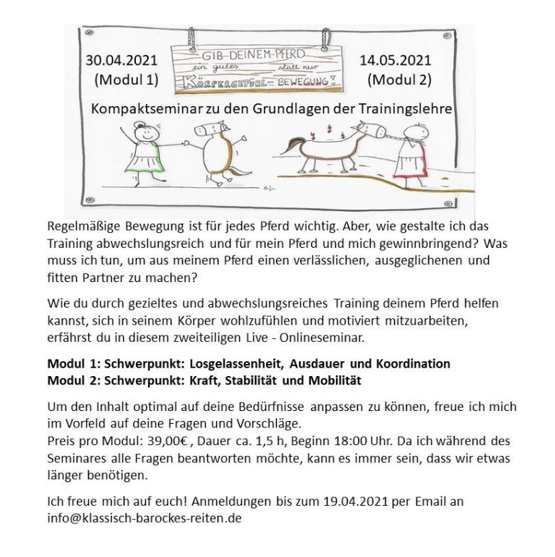 Unsere Trainerin Angelika Deiters bietet ein Webinar zum Thema "Grundlagen der Trainingslehre an. Ich kann sie nur wärmstens empfehlen, sie war Vielseitigkeitsreiterin, ist Trainerin A, Klassisch-Barock und ebenfalls Osteoconcept-Coach (Training, Trainingstherapie, Rehabilitation unter dem Reiter nach osteopathischen Grundsätzen). Ihr ist keine Frage zu blöd, sie kann die Fragen nach dem Warum beantworten und der Unterricht ist anschaulich und logisch für Reiter und Pferd.