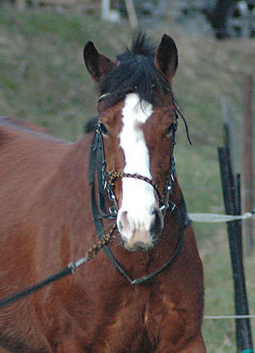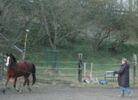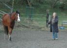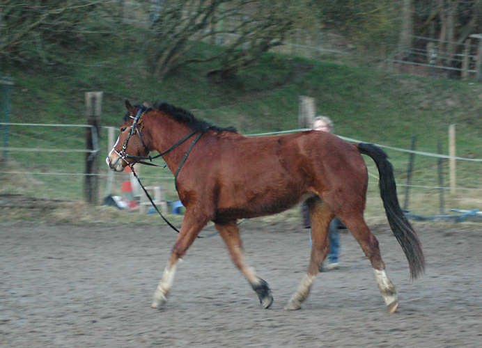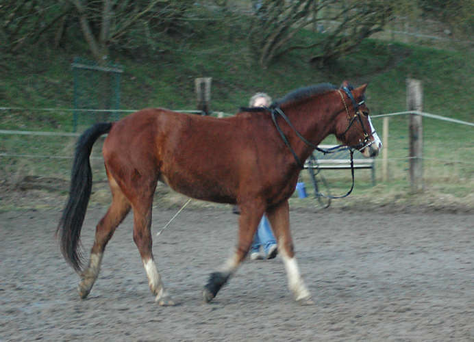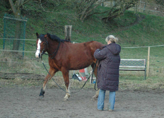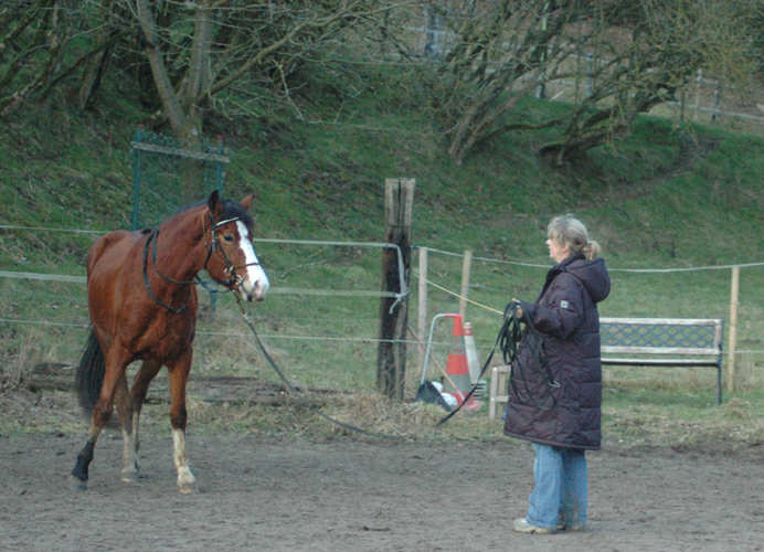 Sobald ich Queshya ein paar mal in der Bahn gritten hatte, gingen wir auch ins Gelände. Das war total unproblematisch. Queshya ist sehr mutig und unerschrocken, so daß es wirklich keine Schwierigkeiten bei den Begegnungen mit anderen Pferden, Fahrzeugen usw. gab.