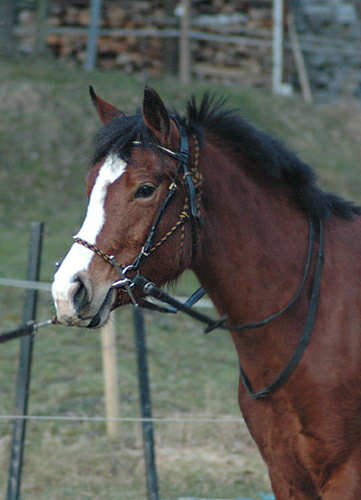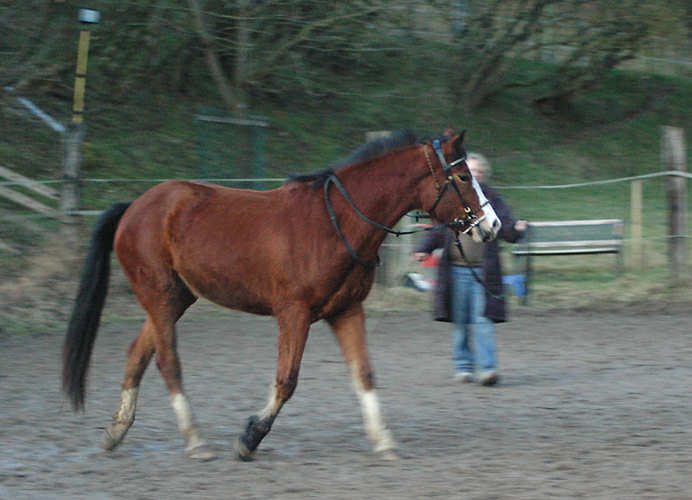 Queshya und Quinn sind die beiden Pferde mit denen ich am Liebsten arbeite. Queshya lernt so unglaublich schnell, daß ich mich sehr bremsen muß. Schlieslich ist sie noch keine 3 und ich hatte mir vorgenommen erst in einem halben Jahr richtig mit der Arbeit anzufangen. Wenn ich mit einem Halfter in den Offenstall komme, steht Queshya sofort bereit und möchte mit. Ich brauche ihr das Halfter nur hinhalten, sie zieht es praktisch alleine an. Wenn wir dann zum "Arbeiten" auf den Platz gehen ist sie richtig stolz. Sie nimt neue Dinge sehr schnell auf und vergißt sie auch nicht. Sie stellt auch nicht immer wieder alles in Frage wie ihre Mama. Dabei hat sie zwar Temperament, ist aber extrem ausgeglichen und ganz einfach zu regulieren. Weil ich mit Reiten und Fahren noch nicht anfangen will, habe ich mit Zirkuslektionen angefanen. Als erstes hat sie das Kreuzen der Vorderbeine glernt. Dafür hat sie an zwei Tagen nur jeweils 5 Minuten gebraucht. An der Longe üben wir hin und wieder 10 Minuten die Kommandos Schritt und Trab und Halt. Ab nächster Woche fange ich mit der Dressurmäßigen Bodenarbeit mit Gebiss nach Philippe Karl an. Neulich habe ich versucht ob sie Schulterherein und Konterschulterherein versteht, ich hatte sie am Knotenhalter. Sie hat es direkt verstanden. Ich hab dann natürlich sofort aufgehört, sollte ja eigentlich nur ein Versuch sein. Sie sieht zur Zeit wieder wie ein Isländer aus...brrrr...naja ich hoffe, daß sie mich wie jedes Jahr im Sommer überrascht... Queshya wird jetzt von Isa angelernt: im Beruf der Leitstute. Immer wieder können wir Szenen wie diese beobachten: Isa steht in der Mitte des überdachten Teil des Offenstalls, Queshya steht bei ihr. Eines der anderen Pferde versucht an einen bestimmten Heusack heranzukommen. Queshya scheucht das Pferd weg. Isa steht da und beobachtet die Szene. Wenn das andere Pferd nicht gehen will, legt Isa die Ohren an das richt in den meisten Fällen um den "Eindringling" zu verscheuchen. Miss und Luna gehen sofort. Samira geht meistens nicht, dann kommt Isa! Neulich habe ich sogar beobachtet, wie Isa Miss strafte, weil sie Queshya gebissen hatte. Ich hätte früher nie gedacht, daß es so etwas gibt. Interessant ist es auch zu beobachten, daß der Wiederstand gegen Queshya durch diese Strategie immer wenige wird. Ich kann mir praktischerweise sicher sein, daß Queshya reguliert wird, wenn sie überschnappt.