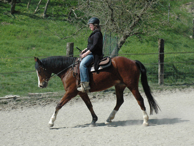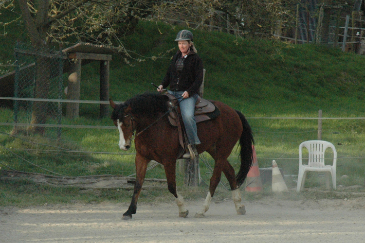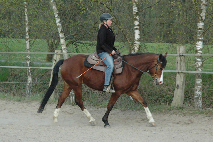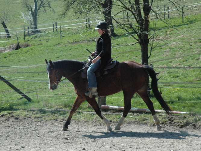 Queshya geht gut vorwärts, ist nachgiebig im Maul, lässt sich leicht abwenden und tritt gut rückwärts. An Stabilität fehlt es noch, Shya lehnt mit der Kruppe nach innen. Tanja gab mir den Tip in den nächsten Wochen daran zu arbeiten die Schulter und die Hinterhand am längeren Zügel zu verschieben um sie dann darüber besser in den Rücken holen zu können. Mein rückwärts lehnender Sitz hat mir die erhoffte Entspannung im Oberkörper gebracht und das Becken ist auch freier. Tanja meint jetzt muss ich meinen Sitz wieder nach vorne korrigieren, damit ich die Beine besser fallen lassen kann.