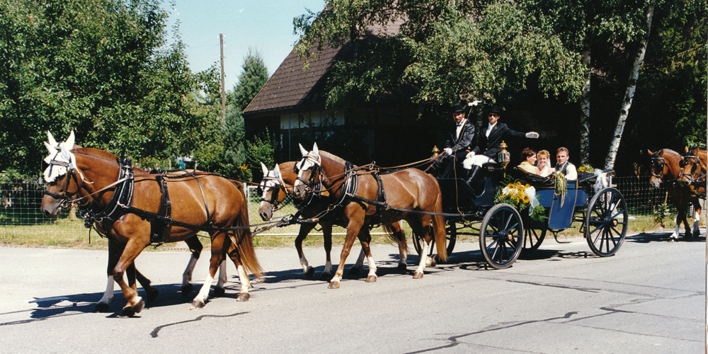 In der Küche der Familie Messer fällt uns das Foto eines pflügenden Vierspänners sofort ins Auge. Die drei Füchse auf dem Bild, sind alle aus einem Guss. Auf Nachfrage erzählt uns Herr Rudolf Messer, dass es sich um seine Zuchtstute Fleurette (Lusco/Urique) und deren Nachkommen, Fiona (Calif/Lusco) Franco (Calif/Lusco) und Canella (Calif/Lusco) handelt.